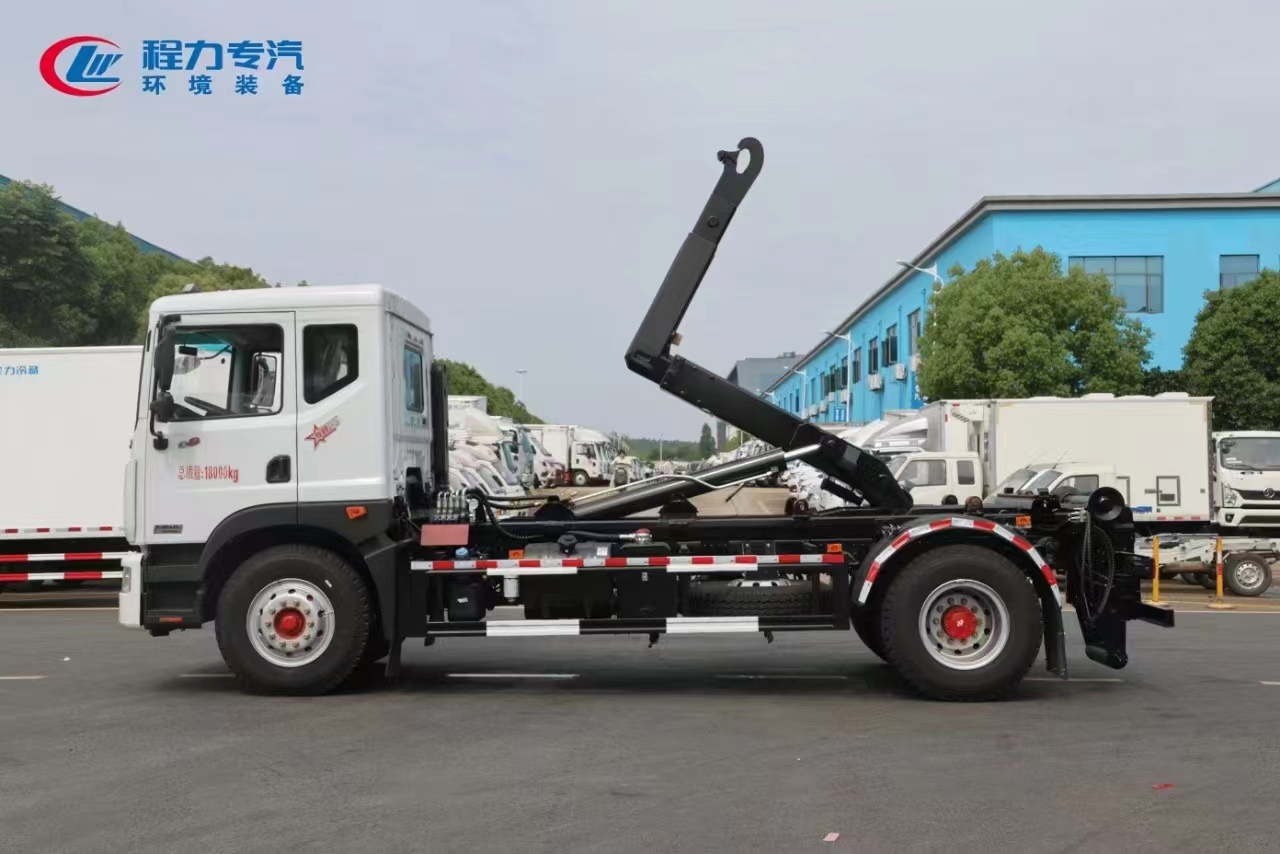 上裝配置 內置安全泄壓閥(獨有技術),配套10-16方勾臂垃圾箱或移動站,主勾臂由高強度板材制作,雙油缸控制,伸縮式主臂,加強型上裝結構,液壓支腿,橫向鎖緊,品牌多路閥,液壓油泵,標配室內外操作(帶遙控),防誤操作,帶平衡閥,液壓鎖。